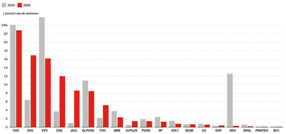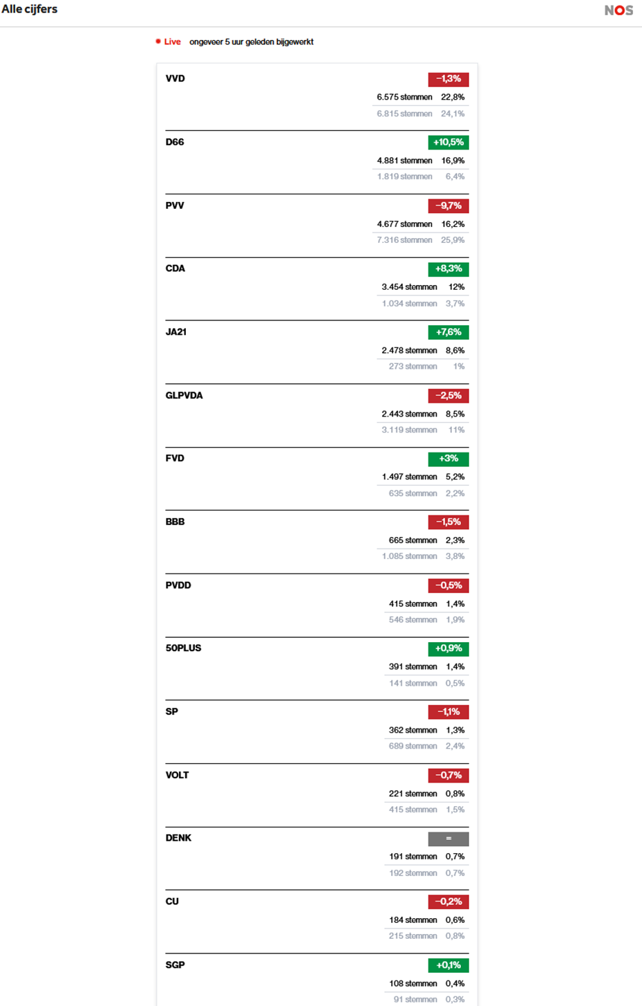 Haalden deze drie partijen bij de verkiezingen voor de Tweede Kamer in 2023 nog samen 29,1 procent van de stemmen, nu komt hun totaal uit op precies 30 procent van de stemmen. Dat toont de publicatie van de NOS.