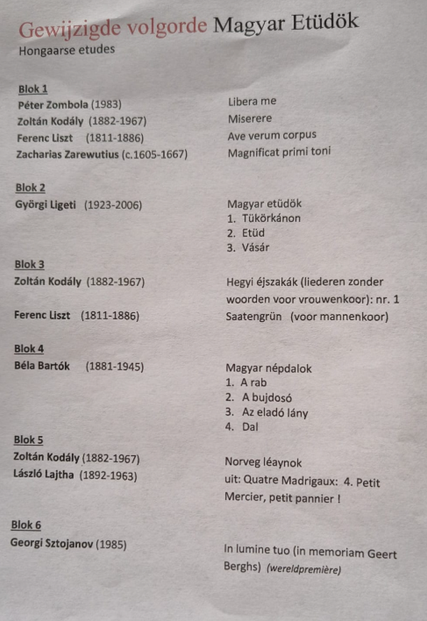 Hij betoonde zich te Noordwijk een buitengewoon enthousiaste en aanstekelijke dirigent die het koor tot grote hoogtes bracht met “Magyar Etüdök” (Hongaarse Etudes), een titel naar het gelijknamige werk van György Ligeti. Het programma “verkent de muzikale erfenis die Hongarije tot een bakermat van koormuziek en muziekonderwijs heeft gemaakt. Het programma zag er zo uit: